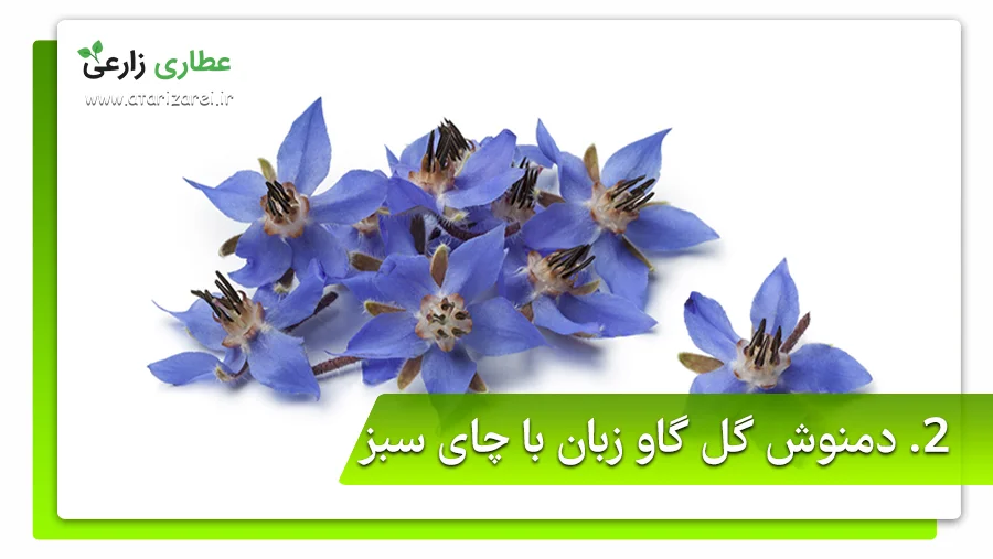 ترکیب چای سبز یکی از روش های دم کردن گل گاو زبان است که خواص بسیاری دارد. در این روش چای سبز را در آب جوش خیس کنید، سپس گلگاوزبان را اضافه کرده و به مدت ۱۵ دقیقه در قوری روی بخار کتری قرار دهید. در نهایت از نبات یا خرما برای شیرین شدن آن استفاده کنید.